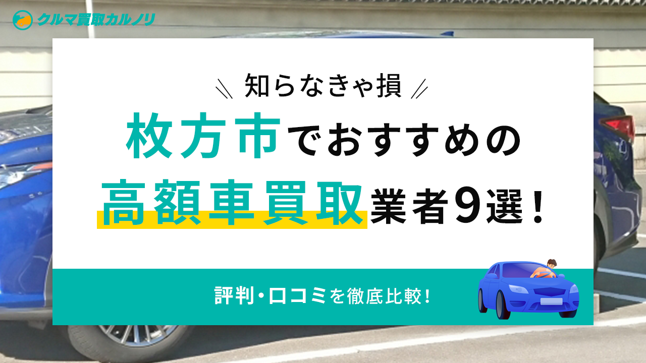 そこでこの記事では、『枚方市や周辺の守口市・門真市・交野市で実績と口コミ評価の高いおすすめの高額車買取業者9選』を厳選して紹介します。また、それぞれの業者の強みや特徴、評判の傾向も併せて解説します。