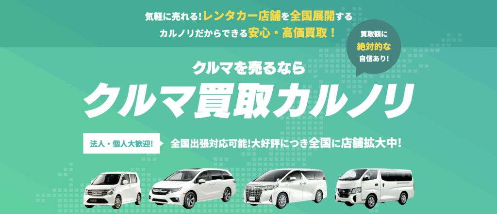 クルマ買取カルノリは、全国に中古車を高価買取する専門業者です。全国展開の「カルノリレンタカー」が運営していて、買取後はレンタカーとして再利用できるからこそコスト削減ができ、高く買取できます。また、実際にユーザーから寄せられる口コミが日本で1番良く、多くの方に満足いただいております。
