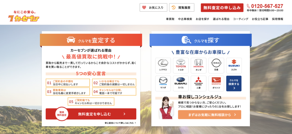 カーセブンは、取引の透明性と安心感を重視する人に選ばれている車買取業者です。買取から販売までを自社で一元化しており、中間業者を解さない流通を実現し、それに伴う各種手数料といった中間コストを抑えています。
