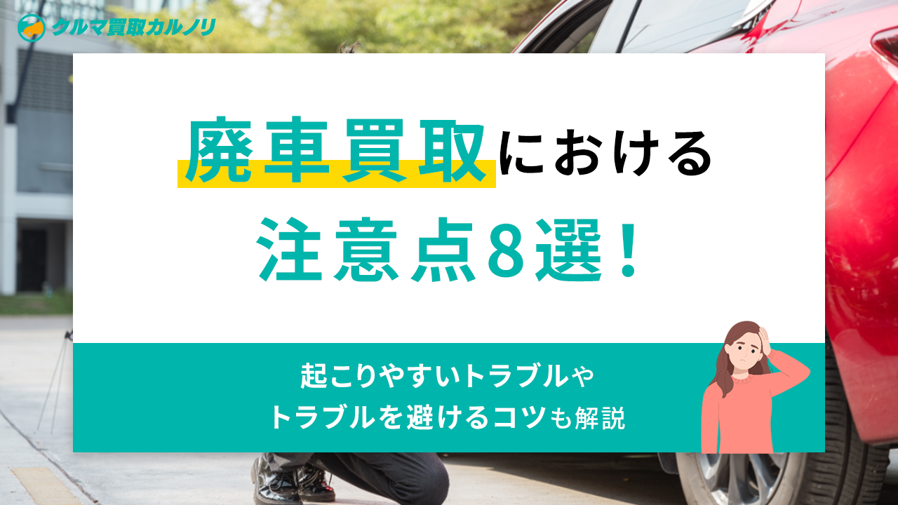 そこでこの記事では、廃車買取の注意点を紹介します。また、起こりやすいトラブルの具体例や、トラブルを避けるためのコツも併せて紹介します。