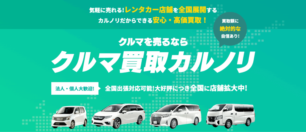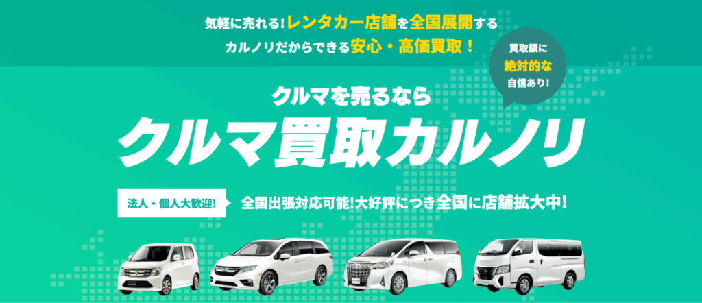 クルマ買取カルノリは、全国に中古車を高価買取する専門業者です。全国展開の「カルノリレンタカー」が運営していて、買取後はレンタカーとして再利用できるからこそコスト削減ができ、高く買取できます。また、実際にユーザーから寄せられる口コミが日本で1番良く、多くの方に満足いただいております。