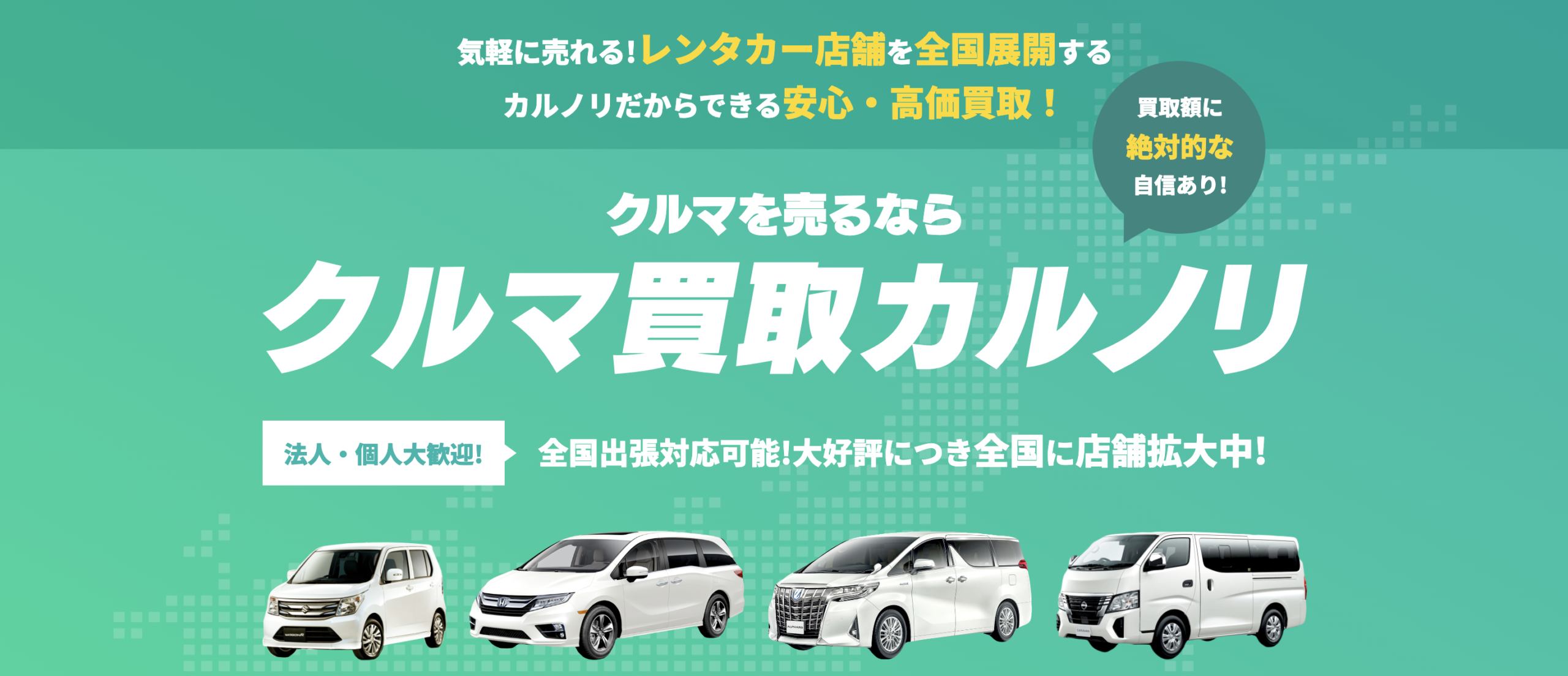 クルマ買取カルノリは、全国に中古車を高価買取する専門業者です。全国展開の「カルノリレンタカー」が運営していて、買取後はレンタカーとして再利用できるからこそコスト削減ができ、高く買取できます。また、実際にユーザーから寄せられる口コミが日本で1番良く、多くの方に満足いただいております。