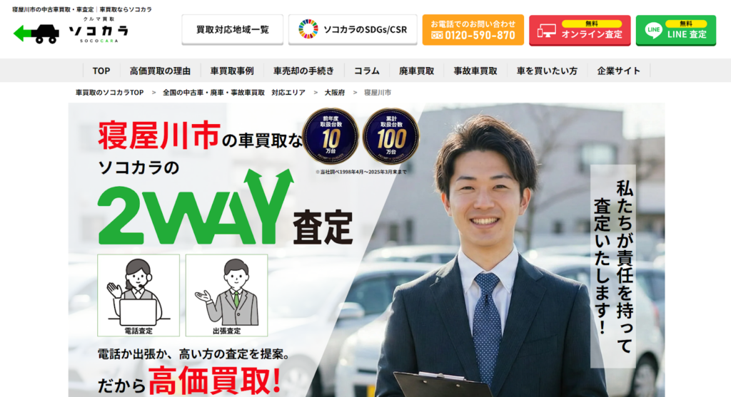 中古車から事故車まで幅広く手掛ける「ソコカラ」は、世界規模の販路を活かした買取力が特徴の業者です。来店不要の「2way査定」を採用しており、状況に応じて電話査定でコスト分を金額に上乗せするか、出張査定で装備を詳しく評価するかを選べます。