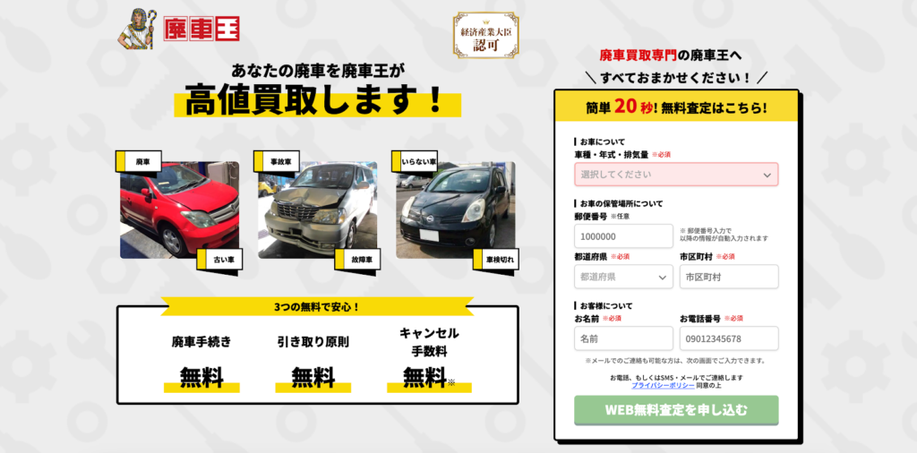 費用の透明性が高く、レッカー代や廃車手続き代行が無料なだけでなく、自動車税などの還付金についても還元を明示しています。LINE査定で手軽に概算を確認できるため、コストを抑えて確実に愛車を手放したい場合に適した1社です。