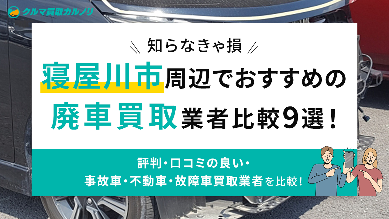 この記事では、寝屋川市でおすすめの廃車・事故車・不動車・故障車買取業者を比較し9社を紹介します。信頼できる業者選びのコツはもちろん、車の処分方法や廃車や事故車、不動車などの手続きの流れも解説します。
