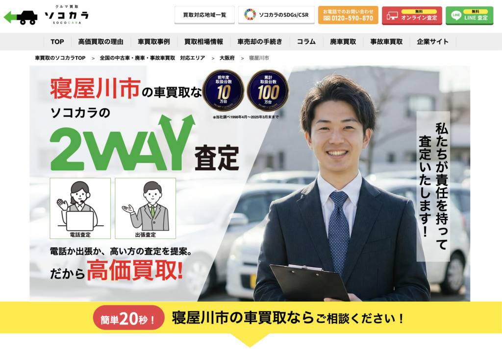 中古車から事故車まで幅広く手掛ける「ソコカラ」は、世界規模の販路を活かした買取力が特徴の業者です。来店不要の「2way査定」を採用しており、状況に応じて電話査定でコスト分を金額に上乗せするか、出張査定で装備を詳しく評価するかを選べます。