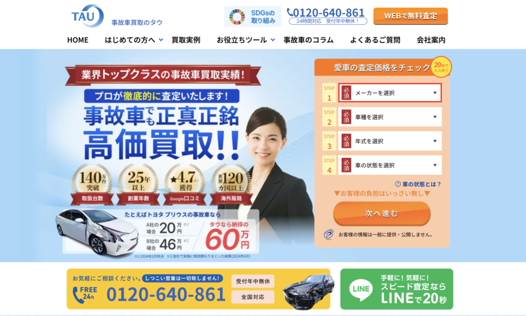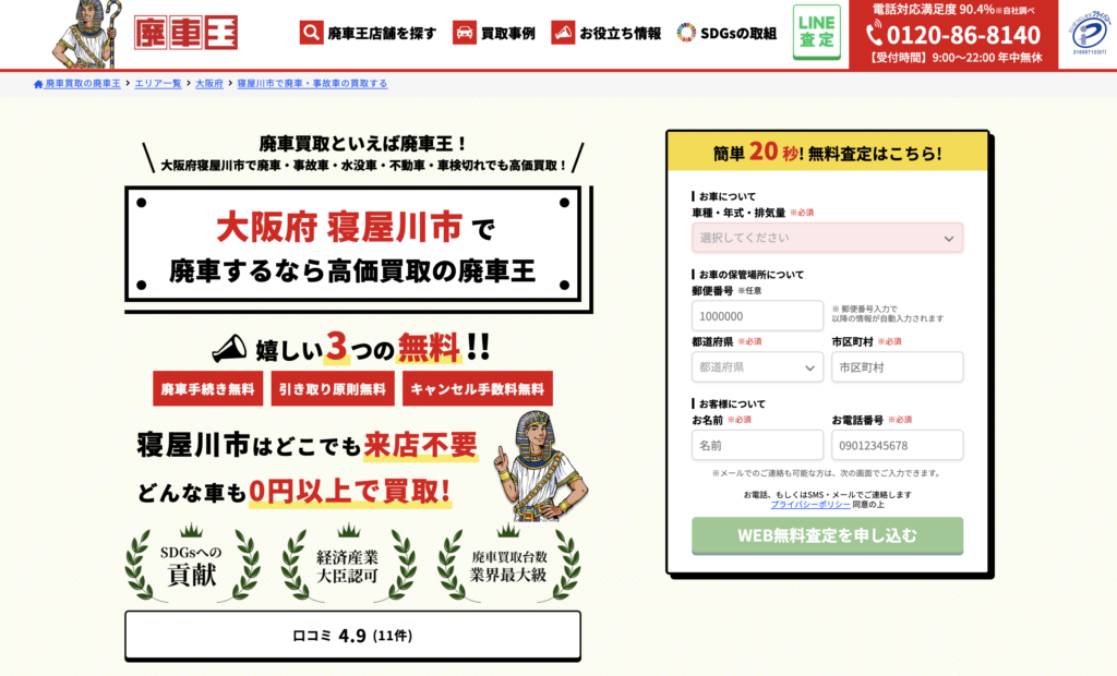 費用の透明性が高く、レッカー代や廃車手続き代行が無料なだけでなく、自動車税などの還付金についても還元を明示しています。LINE査定で手軽に概算を確認できるため、コストを抑えて確実に愛車を手放したい場合に適した1社です。