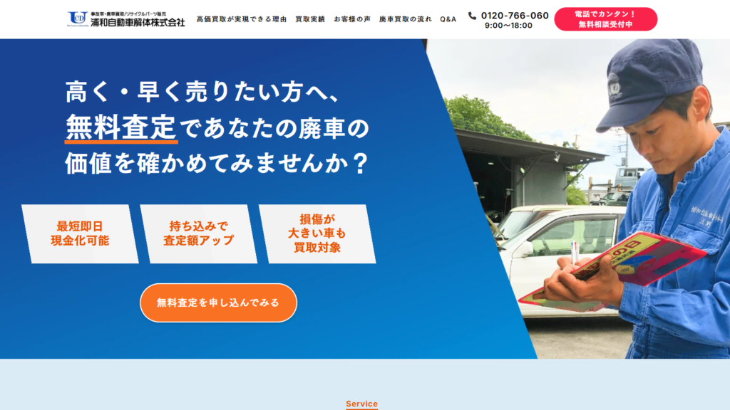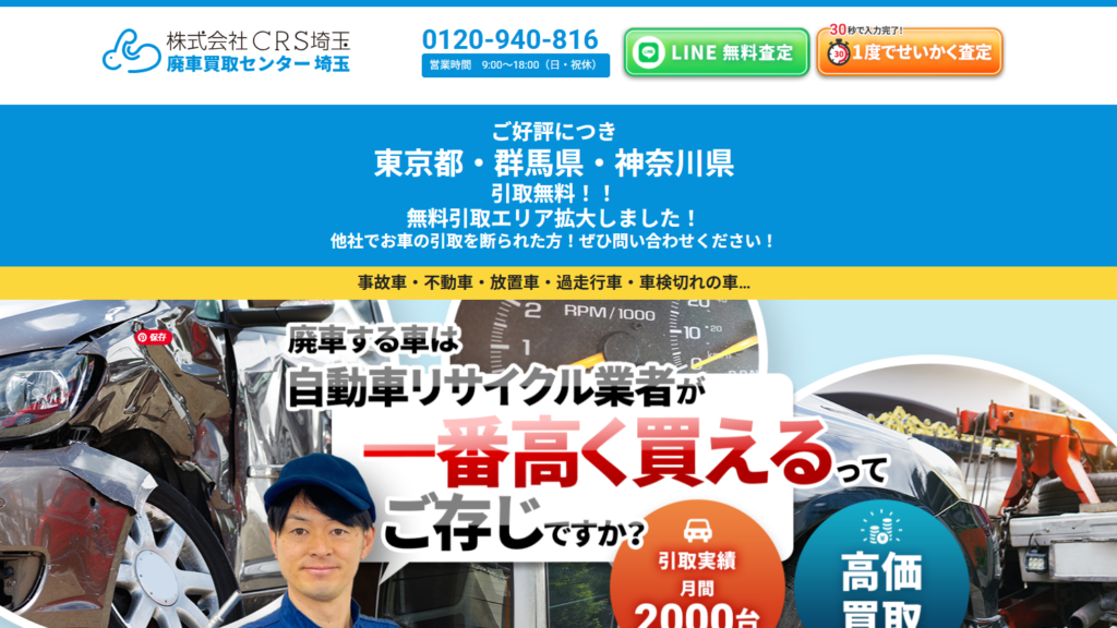 埼玉県全域が対応エリアとなっており、出張査定・引取は無料な上に当日引き取りもしてくれます。特に、自走不可な車やバッテリー上がりの車など、通常の中古車買取店では断られやすい車両でも相談でき安心です。