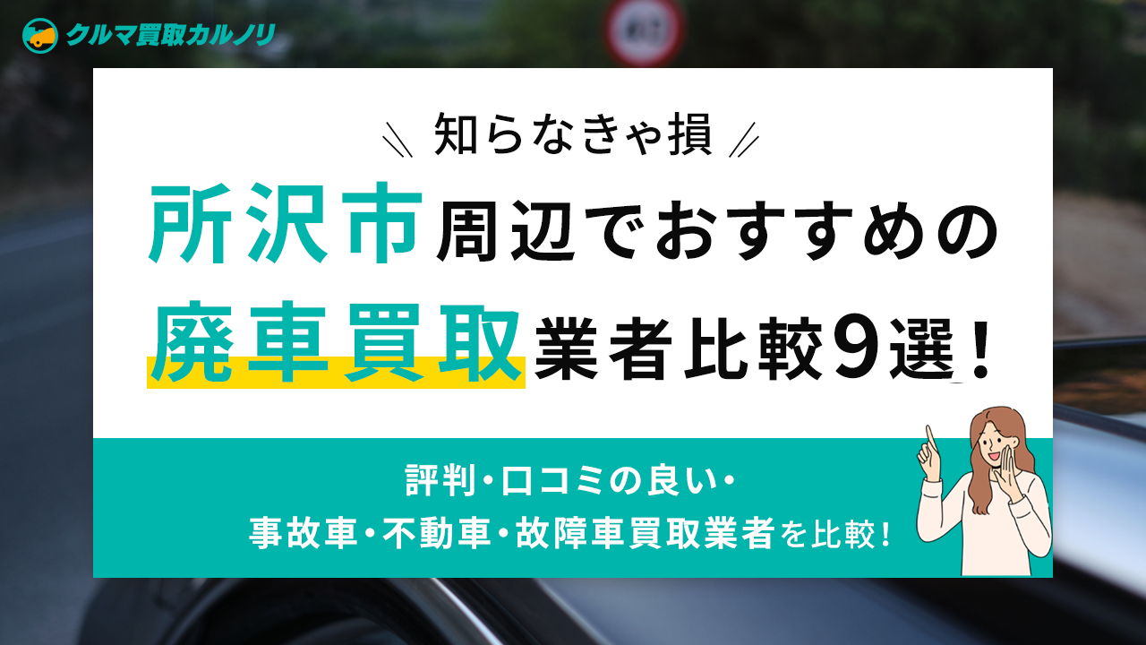 そこで、この記事では『所沢市周辺で評判が良いおすすめの廃車・事故車・不動車・故障車買取業者9社』を紹介します。また、失敗しない廃車買取業者の選び方や、廃車を処分する際の注意点も解説します。